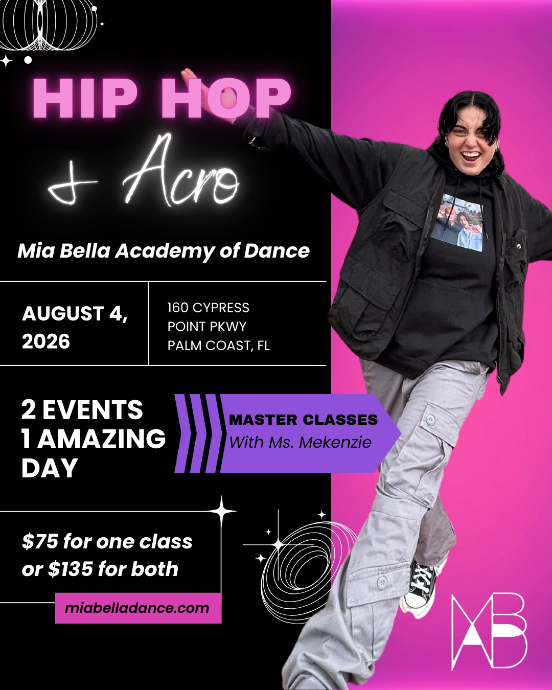 Join us August 4th for an awesome Hip-Hop/Acro master class with Ms. Mekenzie!